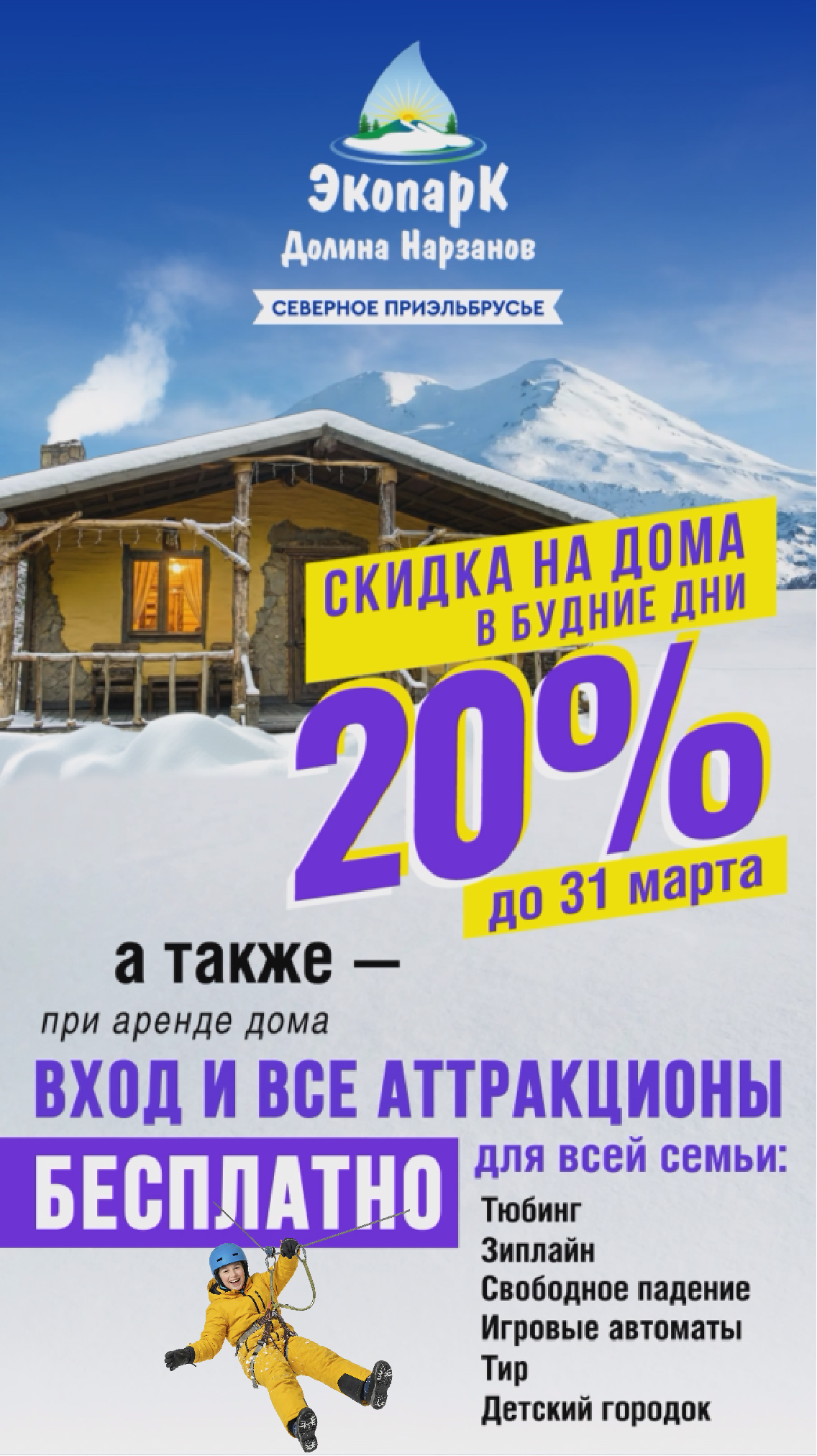 До 31 марта включительно аренда домов -20% + бесплатно: вход/въезд/парковка прокаты на всех аттракционах!